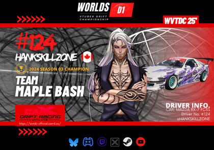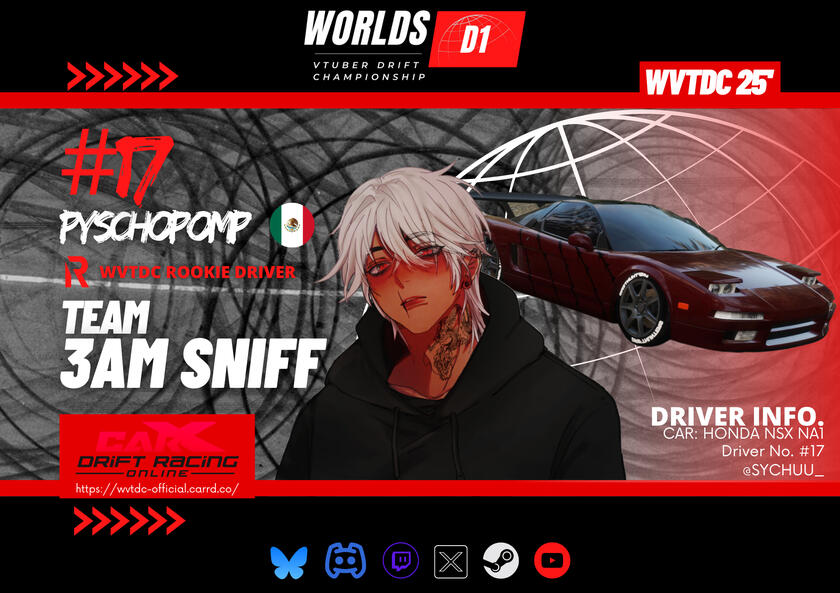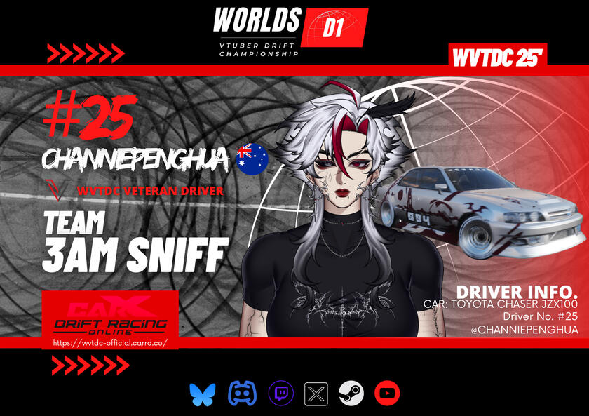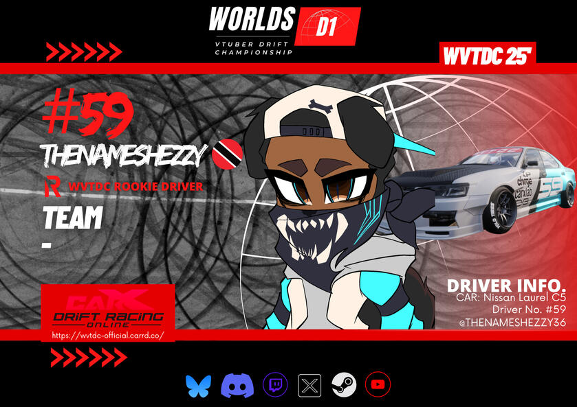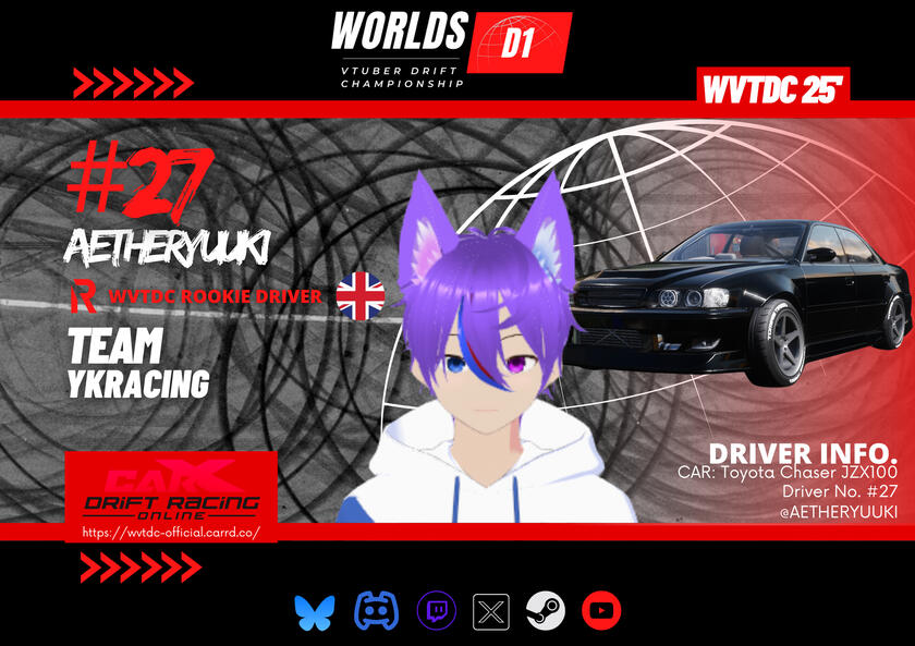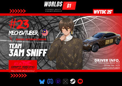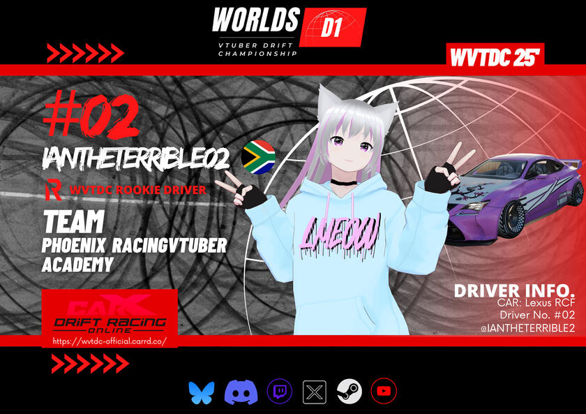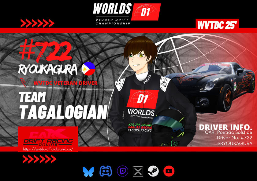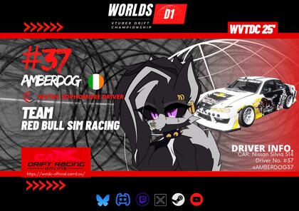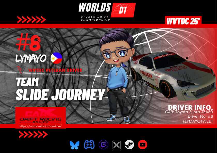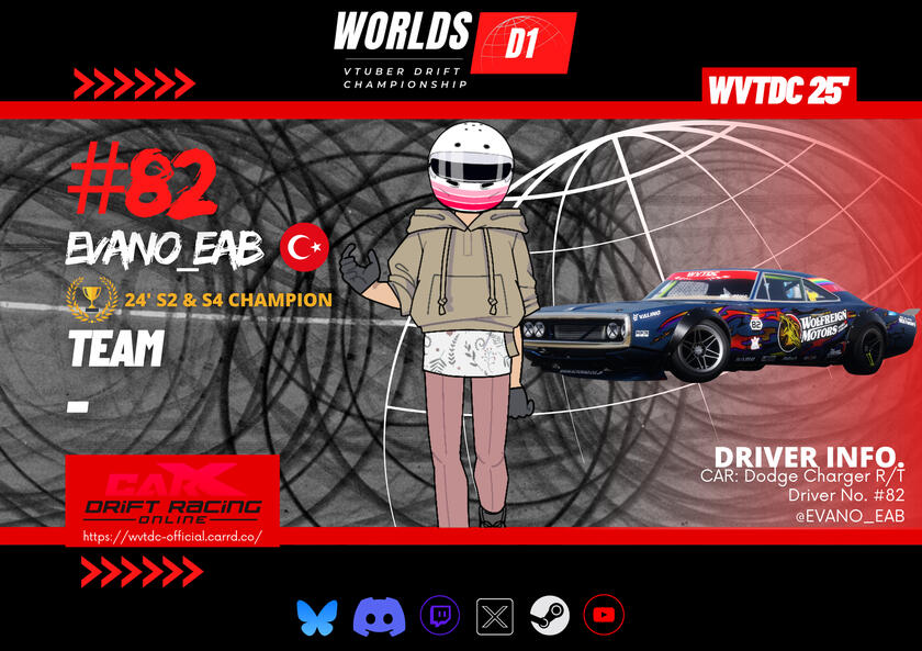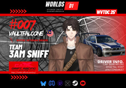 The Worlds VTuber Drift Championship is a friendly six-round tournament series based off the worldwide popular Formula Drift and D1GP motorsport series. The tournament takes place in two parts of the year (Summer Season and Winter Season) and is played on the game CarX Drift Racing Online. This high-skilled, high-powered e-sport is where drivers intentionally maneuver their cars into well executed, controlled sideways slides at high speeds through a marked course, has a variety of drivers & teams competing in the six championship rounds in 2025. Judged on execution and style, rather than who finishes the course in the fastest time.A competition to put on a show for all the viewers and fans around the world. This tournament welcomes VTubers of all skill-levels to compete for a chance to become the best driver in the 1 vs 1 battles from the top-8 round, all the way to the final of each round to become the WVTDC Champion at the end of the season.All participants are required to be VTubers and must abide by all Tournament Rules stated in the discord server and registration form in order to be registered as an official participant!