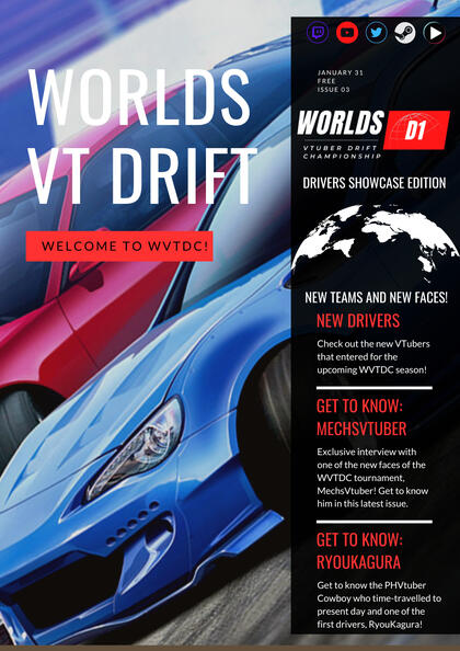 The third issue of the WORLDS VTUBER DRIFT CHAMPIONSHIP magazine is now available! Free to view and download, this issue focuses on the new group of VTubers that have joined as competitors for the upcoming Exhibition Tournament and 2024 Official Season. Get to know a bit about all the drivers here, their channels, who they are and also the cars and/or teams they're representing!Also featured in this issue is two exclusive interviews with drivers MechsVtuber and RyouKagura. Get to know more about rookie driver MechsVtuber and WVTDC veteran driver RyouKagura where they answer a few questions and hear their thoughts on what's to come for them as a driver and for their channels as VTubers.We hope you enjoy the new magazine issue and see you all this Friday at ATRON Circuit for the EX. 2 Tournament!