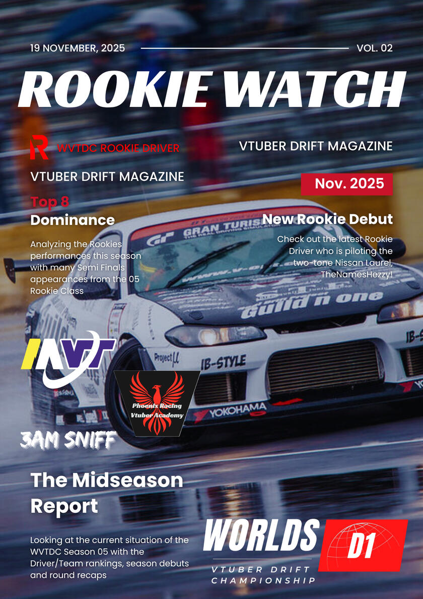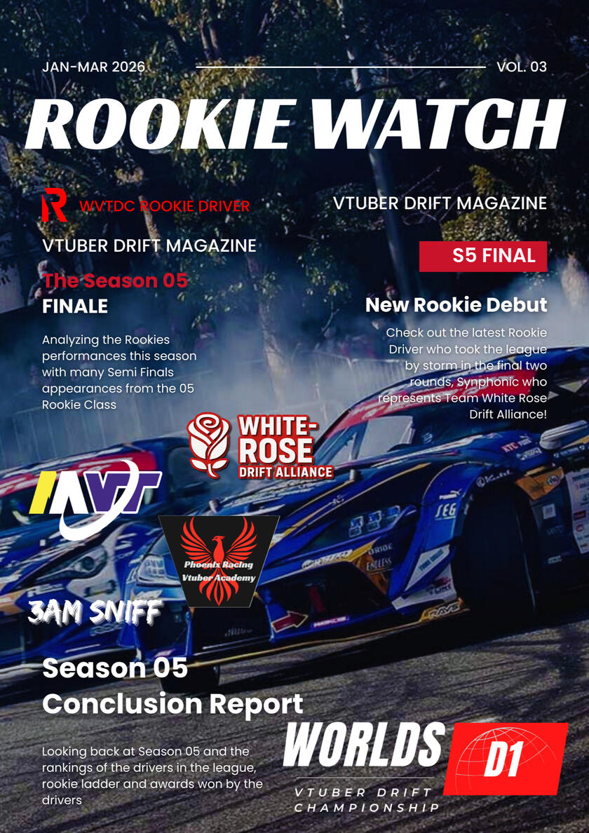 Special Issue Series: Rookie Watch (S5)The newest issue Issue 6 of the WORLDS VTUBER DRIFT CHAMPIONSHIP magazine is now available for all to freely download and view!A special return of the WVTDC Magazines as the WVTDC introduces a special series called Rookie Watch. Rookie Watch is your magazine issues where you check out the current WVTDC Season through the Rookies perspective! From getting to know the drivers, to seeing how they do throughout the rounds, this series aims to promote the Rookie Class to showcase them to the community around the world.We hope you enjoy the new magazine issue and see you all in the second round of the 25' WVTDC Season 05 at Okuibuki Motor Park!