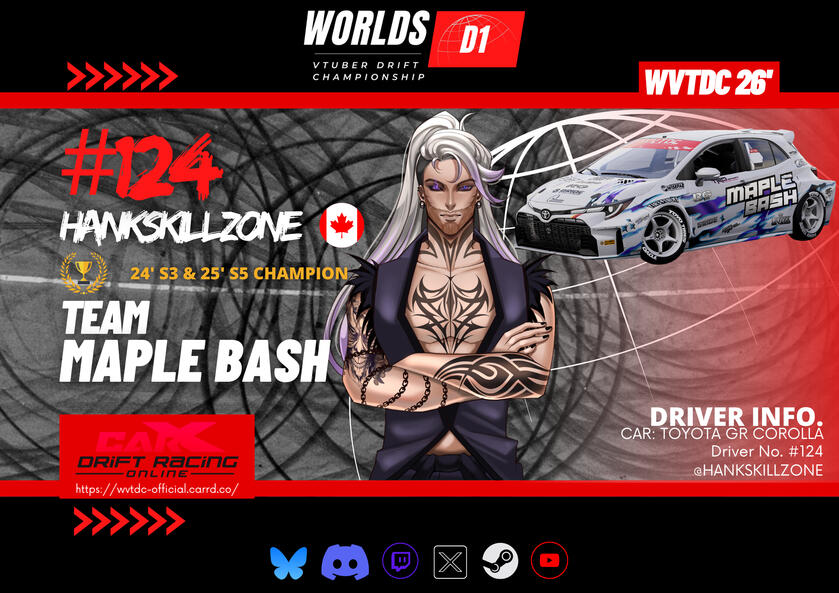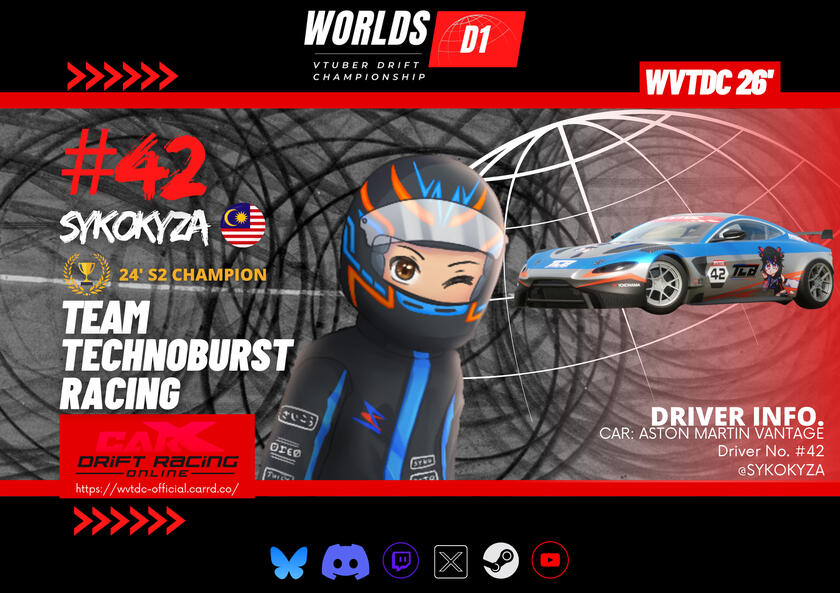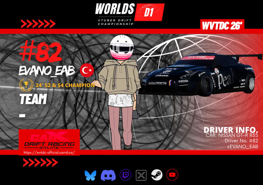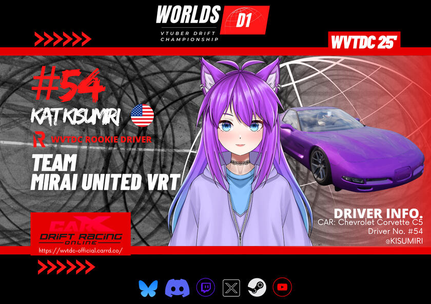 The Worlds VTuber Drift Championship is a friendly six-round tournament series based off the worldwide popular Formula Drift and D1GP motorsport series. The tournament takes place in two parts of the year (Summer Season and Winter Season) and is played on the game CarX Drift Racing Online. This high-skilled, high-powered e-sport is where drivers intentionally maneuver their cars into well executed, controlled sideways slides at high speeds through a marked course, has a variety of drivers & teams competing in the six championship rounds in 2026. Judged on execution and style, rather than who finishes the course in the fastest time.A competition to put on a show for all the viewers and fans around the world. This tournament welcomes VTubers of all skill-levels to compete for a chance to become the best driver in the 1 vs 1 battles from the top-8 round, all the way to the final of each round to become the WVTDC Champion at the end of the season.All participants are required to be VTubers and must abide by all Tournament Rules stated in the discord server and registration form in order to be registered as an official participant!